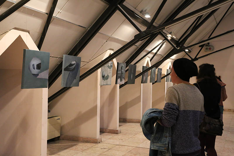 „A végén mindent másképp lát az ember…” énekelte a hatvanas években Zsolnai Hédi. „Jól csak a szívével lát az ember. Ami igazán lényeges, az a szemnek láthatatlan…” – mondta Saint-Exupéry 1943-ban. 1600-ban Hamlet kérdi: „Nem látsz te semmit?” A királyné válasza: „Semmit; pedig jól mindent, ami ott van.” Hamlet: „Nem is hallottál semmit?” A királyné erre: „Semmit én. Kettőnk szaván kívül.” Régtől napirenden lévő összefüggések. A látott dolgok rendje, a látható valóság mögött tételezhető, és ugyancsak létezőnek tetsző dimenziók és a rejtekezés, a felfedezés készsége és képtelensége egyaránt kérdéseket fogalmaznak meg: ezúttal Erdei Adrienn festményeinek láttán. Egyes esetekben talán túlontúl frappáns, magától értetődő formában, de ezt a tételt teljesen menti a tény, hogy a tisztán realista indíttatású kiindulást megzavaró, majdhogynem szürrealisztikus zavarkeltés (a bukósisak bevetése) bizonyos tanulmányi célok kielégítését is elvégzi. Így viszont bizonyítja a festői eszközök használatának magabiztosságát, (kissé távolabbról nézve egyébként a közönség részéről elvárt bizonyításkényszer is játszhat a stílusbravúrok előadásában némely szerepet). Viszont valódi, igazolható, személyes önvallomásnak is tekinthető „manifesztumban” szól Erdei Adrienn arról, hogy miként is éli át, értékeli ezt a „talált jelet”, amelynek „bezártsága, maszkszerűsége, koponya formája” izgalmat keltett benne. A nagy képek alakjai a nézőnek többnyire háttal állnak és ruhátlanok. „Fogyasztói” szempontból hálás megoldás ez a meztelenség. (Megérdemelne ez okból egy felelős gondolati kört annak a felmérése is, hogy a formális kiürülésig vagy kommersz fogyasztói emblematika létig milyen mély jelentésváltozáson, jobban mondva jelentésvesztésen ment keresztül az akt megjelenítése az utóbbi fél évszázadban.) Amivel azt is érzékeltetni szeretném, hogy miközben Erdei Adrienn közvetlenül fejezi ki a védtelenséget, kitárulkozást, és ebben a „nem rejtettségben” kifejeződő megadást a sisak törhetetlenségével, védő funkcióinak ergonómiai makulátlanságával szemben, azért a mezítelen alak sem csak tiszta és semleges test, hanem a fiatal emberi alkat érzéki teljességében előálló sokértelműsége, valóban színes jelentéskörrel felruházott jel. Nem tévedett az érzéseiben a művész: a test és a sisak nem idegenek egymástól, együttes szereplésük az évezredes vizuál-történelemben éppúgy feltalálható, mint a jelen film és színházművészeteiben. De igen érdekes, hogy ma már nem kizárólag és tiszta az a jelképi értelem, ami a sisak-szerkezet és a mezítelen test együtteséből sugárzik. Valószerűbb, kevésbé képletes, ezért sokkalta érzékibb a kép. A ritkán magában való érzéki – festői megjelenítés és a hozzá tapadó, könnyebben fogalmi természetűvé tehető időszerű jelentés tömörítése mutatkozik tehát Erdei Adrienn legfőbb feladatának. Miközben persze látjuk, hogy milyen odaadó küzdelmet (kutatómunkát) folytat anyagainak, felületeinek kívánatos hangolásáért, például a számára kívánatosnak tetsző acélszürke, kékes-ezüstös árnyalatokban megfogalmazott ellenpontért, ami a narancs és rózsaszín-barna testszínek világító-hővel telített plasztikáját koronázza. A kutatómunkát indokoló kérdések között felfedezzük tehát az arcmással összefüggő dilemmát (portrészerűség/arctalanság), vagy egyáltalán, az organikus test/ mechanikus tárgyszerűség (bábszerű demonstráció) kettősséget, a valóságos – realisztikus és fikcionáltan – realisztikus rész-egész viszony labilitását, ami így egymás mellett és együttesen tényleg egy újszerű festői nyelv benyomását eredményezik. A kiállított művek egy része, a papírlapokon látható, térbe állított, rövidüléses térbeli viszonylatokat és leegyszerűsített festői megjelenítést követő darabok elvontabb megfogalmazásától vezet a teljesebb festői vértezetben megjelenő nagyméretű olajképekhez – noha azt is érezzük, hogy a térfelek között folyamatos oda-vissza „közlekedés” folyik. Nem sok kétségünk van afelől sem, hogy a festői állítások, a kompozíció biztonsága érdekében előkerül a fotó-használat, amibe bele érthetjük a fénykép manipulációjának eseteit is. Teljességgel hihető azonban, hogy mindennek a célja a „lehető legátgondoltabb, legtisztább” modell létrehozása, amely érdemes arra, hogy festőileg is rögzítve legyen. A véletlenekkel szemben felvértezett (sisakba bujtatott) alakok figuratív mivolta, elrendezésük, beállításuk klasszikus műtermi rutinja mellett azonban Erdei Adrienn munkáinak más ciklusaiban megjelenít „egy szabadabb, pillanatszerűbb megfogalmazást, mely expresszívebb irányba mozdul” – ahogy maga is említi a kiállítást kísérő kis „manifesztumában.” A szürke árnyalataiban megfogalmazott sisak sorozat „[…] a pontosan átgondolt, merevebb hozzáállással készített munkafolyamatnak ellentéteként[…]” is felfogható, hiszen itt képenként más-más festői és valóság-összefüggések jelennek meg.