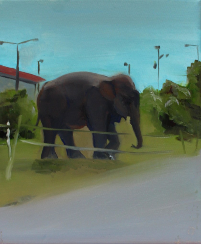 A Vendég című festményen egy elefánt a főszereplő, ami nem a megszokott állatkerti vagy cirkuszi közegben van, hiszen a háttérben házak és villanypózna sejlik fel. A festmény mérete meglepően kicsi, intim, ami feszültséget kelt a valóságban nagyméretű állathoz viszonyítva. Az elefánt egy véletlen földesúti séta alkalmával bukkant fel előttem, teljesen meglepő módon. Irreális helyzetnek éreztem és elindított bennem több gondolatot és érzést. Köztudott, hogy az elefántoknak szoros kapcsolata van halott egyedeivel, és egyfajta gyász folyamaton mennek keresztül egy-egy halálesemény bekövetkeztekor. Emiatt az elmúlás, a halál, a cirkuszi haláltánc jutottak eszembe.