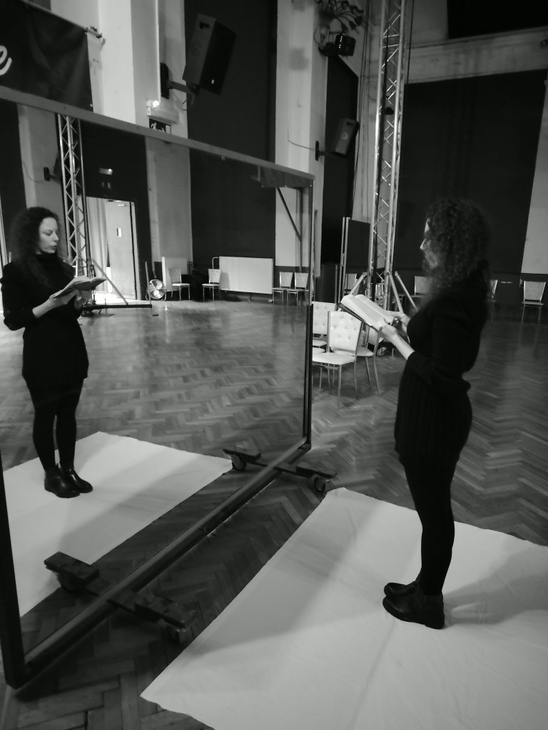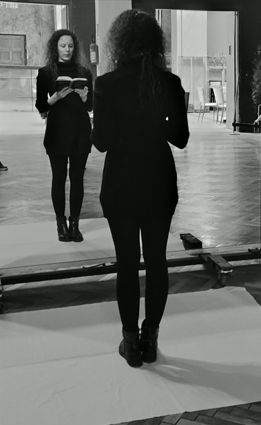 At the school where I teach, every year we create performances, actions, and installations following the work of Miklós Erdély and the INDIGO group (which was the subject of my teaching thesis). This year, following Erdély’s spirit, I also participated in the actions. Everyone prepared an individual piece on a commonly chosen theme. In my performance, dressed in black and standing on a white drape, I read aloud an excerpt from Carl Gustav Jung’s Thoughts on Nature, which deals with Jung’s views on shadow work.
