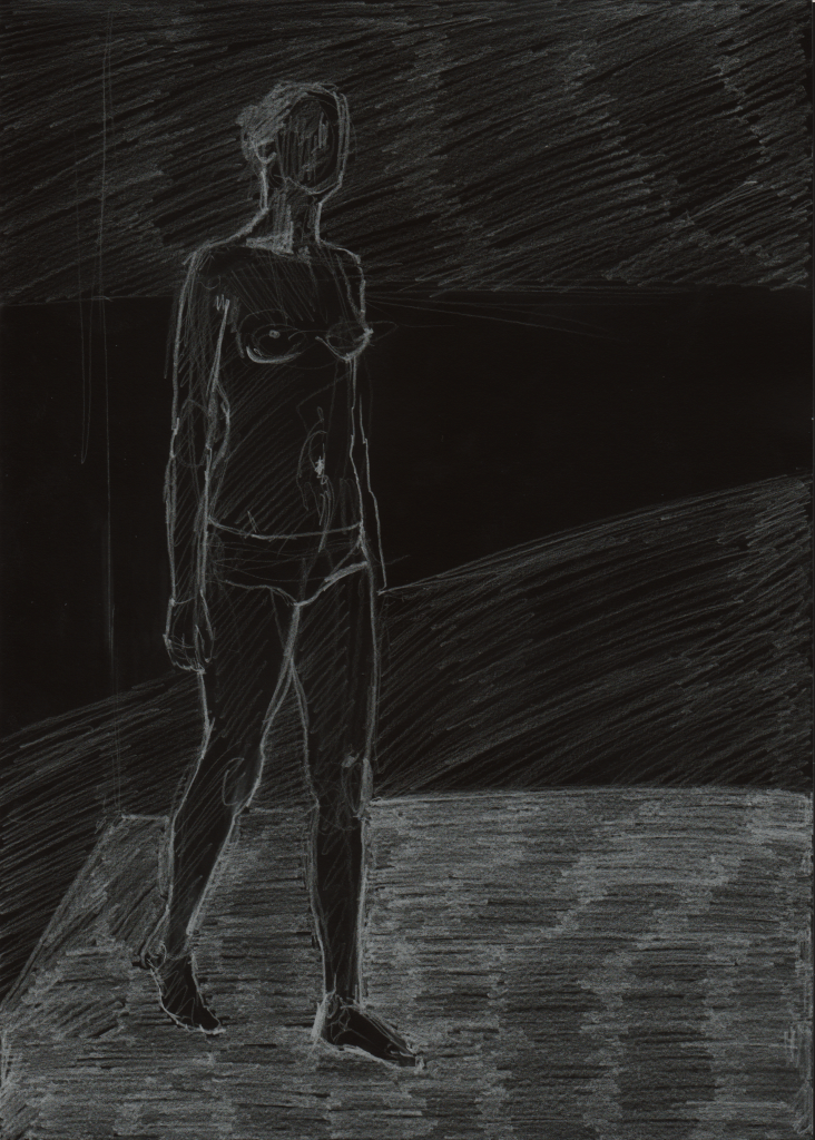 The helmet is a personal object and closure. It is mask-like skull-shaped, which includes many possibilities of association. Paired with the naked figure, we see a paradoxical result. Concepts such as portrait – non-portrait, adult – child, freedom – confinement, mechanical – human, alienation, vulnerability, female identity, vanitas, living or dead can surface, enhanced by displaying different personal spaces.
