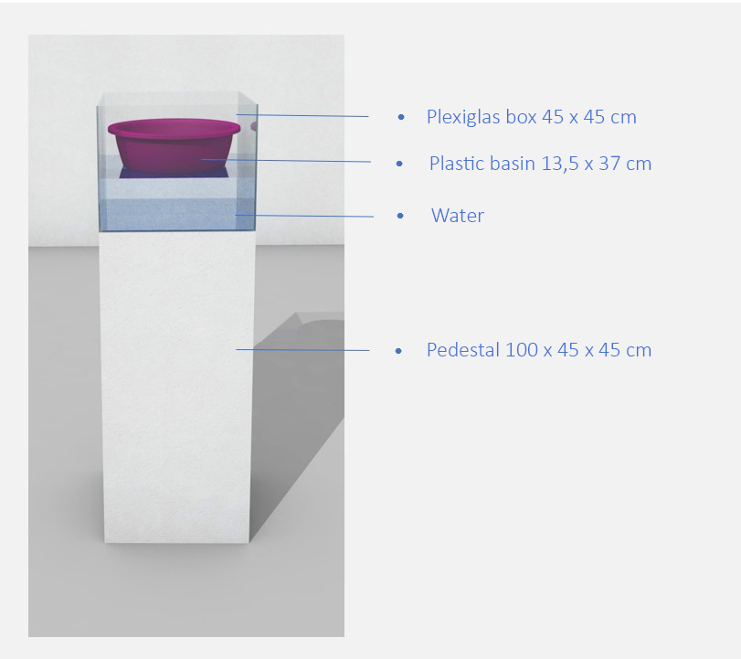 Boat 2023, Works Boat, installation 3D plan, water, plexyglas box, plastic basin, 2023. Exhibition plan 3D pictures